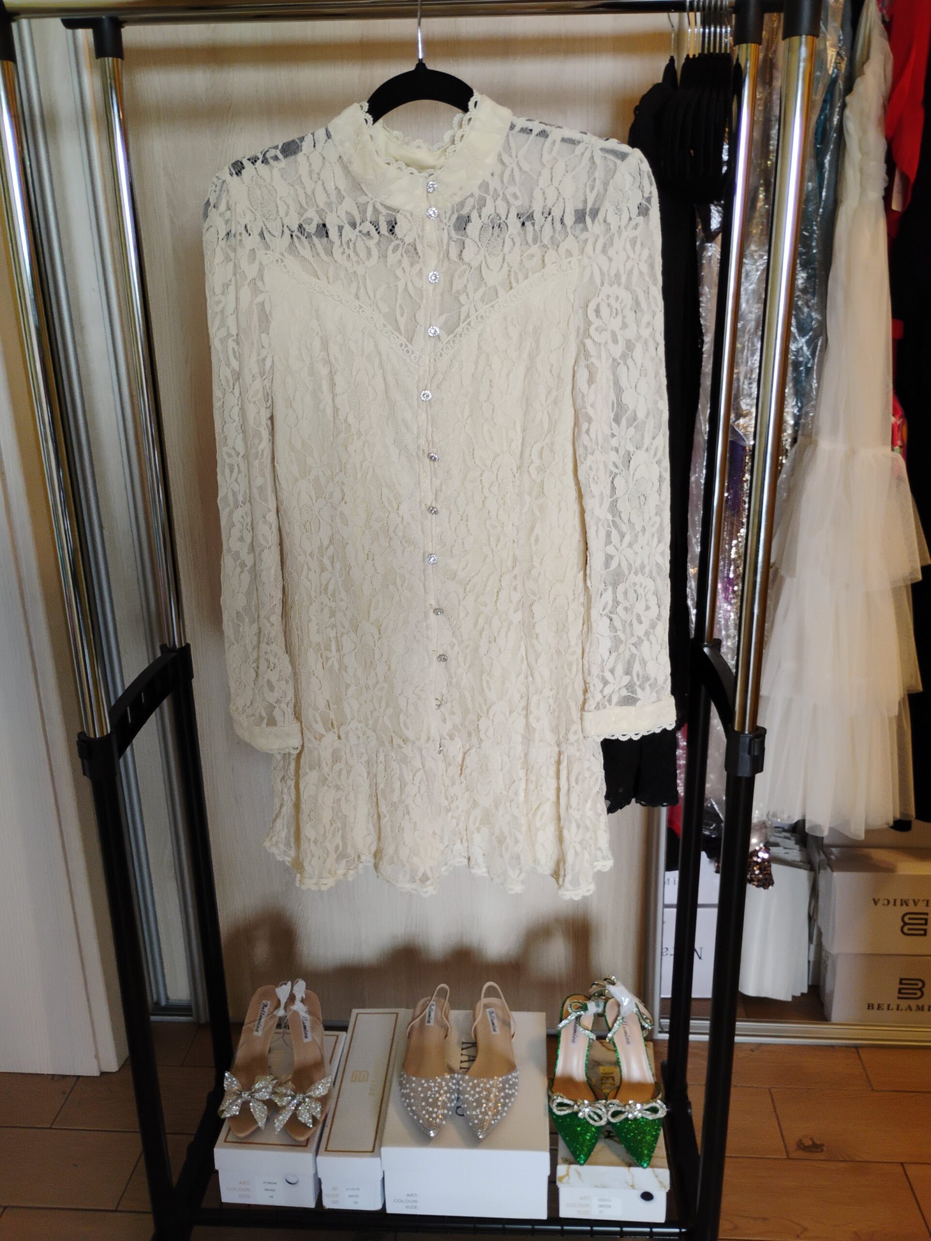 Sukienka beżowa koronkowa ze zdobionymi guzikami rozmiar uniwersalny